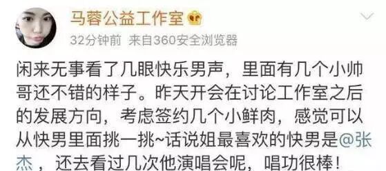 但是,却有一件很有意思的事发生在他身上,虽然宋喆被抓了,马蓉声称要出单曲拍公益电影,还成立了“马蓉公益工作室”,注册了同名微博,发状态用来吸引粉丝。马蓉这一招估计是为了洗白自己的臭名声,不过明显效果不大。不过小伙伴们都低估了马蓉脸皮的厚度,马蓉又在一片骂声中向张杰表白,想把张杰签下来!