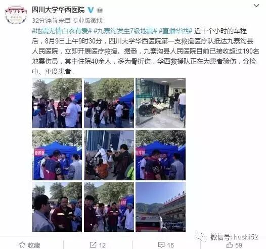 @四川大学华西医院:近十个小时的车程后,8月9日上午9时30分,四川大学华西医院第一支救援医疗队抵达九寨沟县人民医院,立即开展医疗救援。