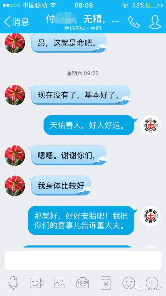 治疗共6个月,期间未做精液复查,10月底其妻已知意外怀孕。现孕5个月,妊娠反应消失,孕检一切正常,全家皆大欢喜。