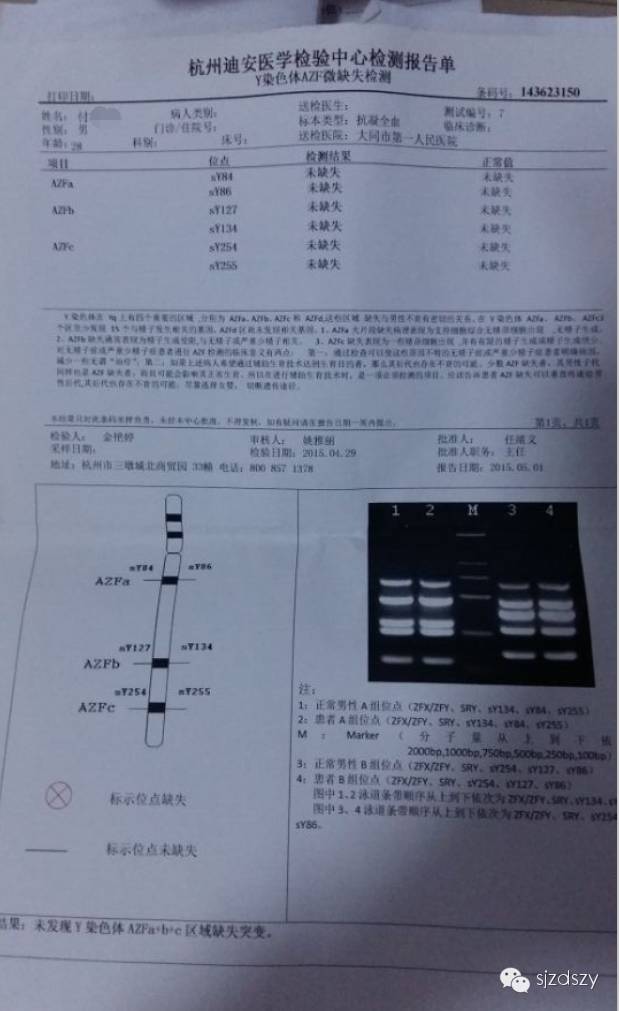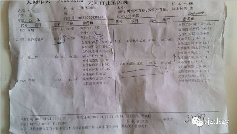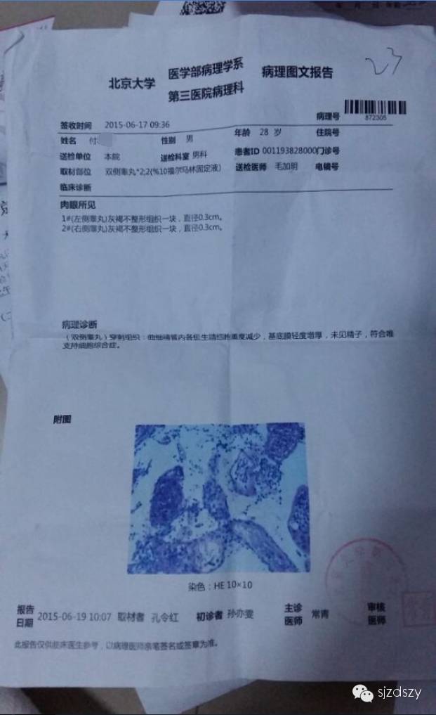 付先生,今年29岁,结婚后一直没要上孩子,2015年4月份,在大同市儿童医院确诊为无精症,睾酮促黄体生成素雌二醇孕酮数值正常,垂体泌乳素18.91ng/ml(参考值2.1-17.7),促卵泡生成素21.50mIU/ml(参考值1.4-18.1),2015年4月29日,抽血检查染色体,2015年6月1日出结果显示,染色体核型正常,无缺失,故排除先天性无精症。由于病情较重,当地大夫建议去北京大第三医院进一步检查。2015年5月13日,在北京大学第三医院生殖科就诊,检查精液经离心还是没发现精子,2015年6月16日,在北医三院进行睾丸活检手术,附睾穿刺,睾丸穿刺,均未看到精子,睾丸切开睾丸组织送病理活检,2015年6月17日病理结果提示,曲细精管内各级生精细胞重度减少,基底膜轻度增厚,未见精子,符合唯支持细胞综合征,大夫根据男性体格检查,发现睾丸发育尚可,未查彩超。目前分析病历较为严重,治好怀孕几率渺茫,现在医学界公认顽疾,没有特效的药物治疗,通常遇到这样的情况直接劝告患者放弃治疗,建议患者考虑精子库供精试管婴儿。