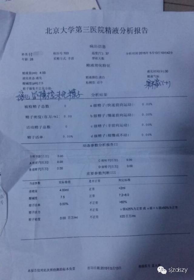 2015年5月22日亲诊,观其舌象:舌质暗淡,苔黄薄腻,号其脉象:脉沉而细,望其面,两眼有神,男性性征明显,综合分析,证属肾精亏损,肝郁脾虚,下焦湿热所致无精。结合既往病史,造成此病机,究其缘故,多有性生活不节制,性欲放纵,施泄无度,损耗肾之真精,加上熬夜,工作压力大,情志不舒,肝郁气滞,饮食不节,影响脾胃功能。癸水耗损,木失疏泄,乙木不升,下陷寒水,郁久化热,形成湿热。加之水寒肾元火亏,不能温土,土生湿邪,不能生血,气血不生,生精乏源。考虑元气尚足,虽西医宣判不治之症,但中医尚有希望。结合舌象脉象分析,虽有治疗希望,但必须遵守医嘱,清心寡欲,养精蓄锐,建议禁欲,早睡早起,戒烟酒,情志宜舒畅,饮食宜清淡,忌油腻生冷寒凉。医患配合,齐心协力。治疗第一步清利湿热瘀阻,疏肝调脾,拟定叁号方案2个月并辅助草药治疗(蛇舌草,蒲公英,土茯苓,红花,桃仁,当归,蟅虫,蜈蚣,甘草,三七,当归等)。