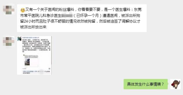日前,一篇名为《怀孕儿科医生被打,反被当成打架嫌疑人监禁》的微博文章在网上疯狂传播,截止到目前已经被点击阅读近150万次。当事人在博文中表示,自己是一名怀孕一个多月的女医生,在4月17日晚值夜班过程中,阻止一名患者亲属插队治疗后,与对方发生冲突。报警后,双方均被带到常平派出所接受调查。