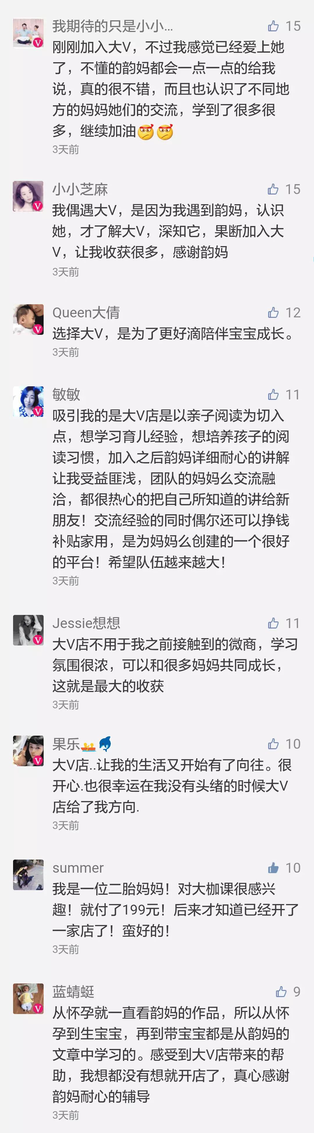 在社群建设方面,在全国有V友会微信群几百个,主要以妈妈及年轻家庭为主。此外,妈妈商学院的在线“妈妈课堂”活动已在全国开课300多期,影响了数百万家庭。 开通大V店,就可以加入v友会,认识更多优秀妈妈,还终生获得一个学院,免费听大咖课。