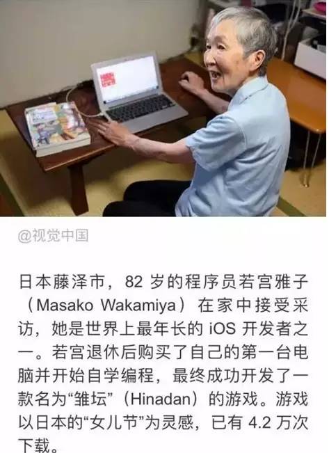 最后再分享一个老奶奶的故事吧。82岁的日本老奶奶若宫雅子自学编程做游戏,现在是最高龄的苹果App开发员。