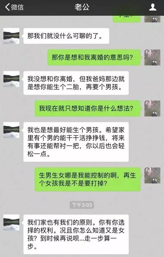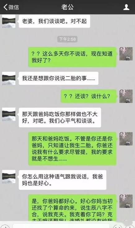 近日,有网友曝出自己和丈夫的聊天截图,称丈夫一家要求自己生二胎,不生二胎就离婚。因为一胎是女儿,女方忍受婆家各种脸色,但对于生二胎的要求,女子坚决拒绝。
