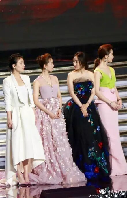 昨晚的晚宴,刘诗诗、杨幂、刘亦菲三人在一组,杨幂是队长,所以三人势必要站在一起,一开始大家上台时,三人的站位是刘诗诗、刘亦菲、杨幂。