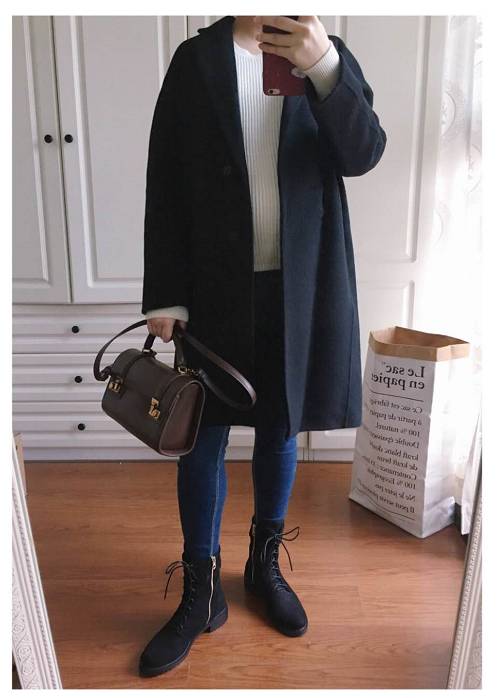 下面穿条打底裤,腿上再穿双黑色平底过膝靴,
