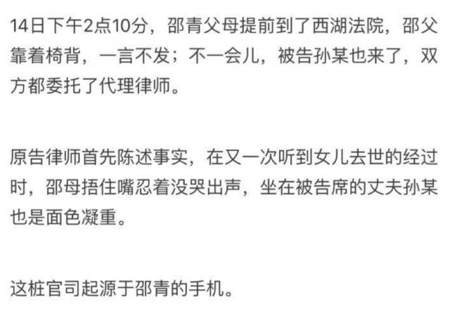 9月14日下午2点30分,邵青父母委托律师就邵青的生命权纠纷问题,将女婿孙某告上法庭,要求孙某赔偿死亡赔偿金、扶养人生活费、精神损害抚慰金等共计80余万,并要求依法分割邵青名下遗产。