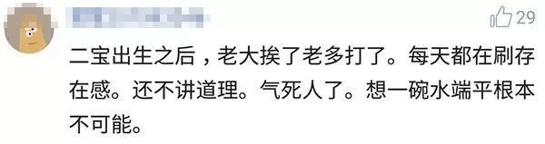 可能有了两个孩子,家里难免闹腾,小的在哭,大的再闹,我们心理上认为,小的不懂事,大的已经稍微懂事了,就不能体谅一下妈妈,总会控制不住冲他发火。