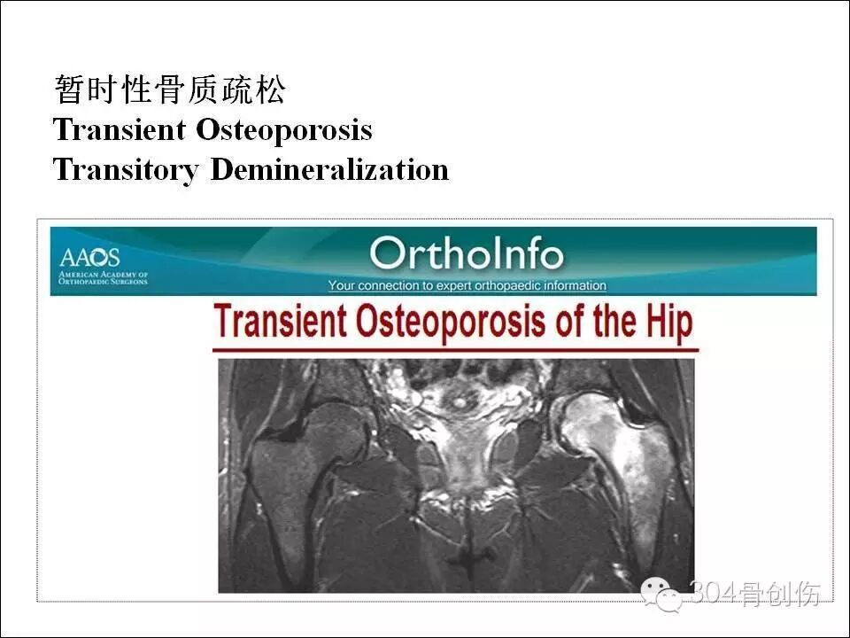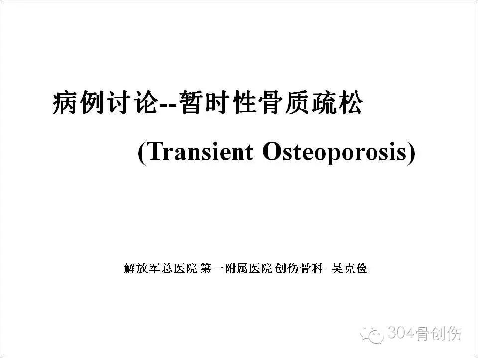 ①常发生在妊娠末三个月,产后2个月内恢复;②轻度外伤即可导致髋部疼痛及活动受限;③X线检查可见明显的单侧或双侧髋部骨质密度减低,同时可见髋部骨折,MRI T1加权像示骨髓信号强度减弱,而T2加权图像的信号强度增加;④与骨质疏松相关的生化指标,如血沉增快和尿羟脯氨酸水平升高等(本病例未见明显异常);⑤骨密度降低。