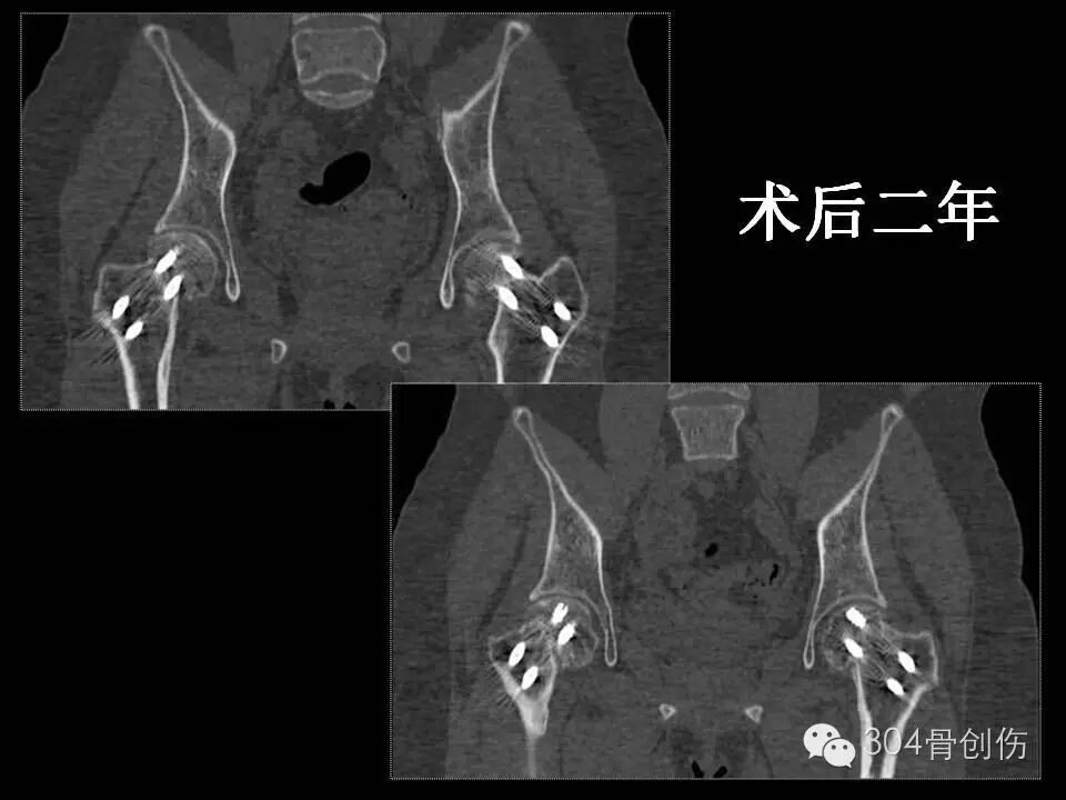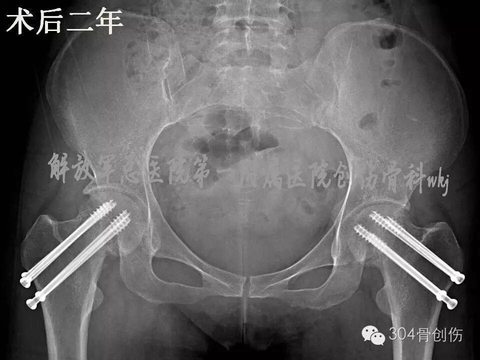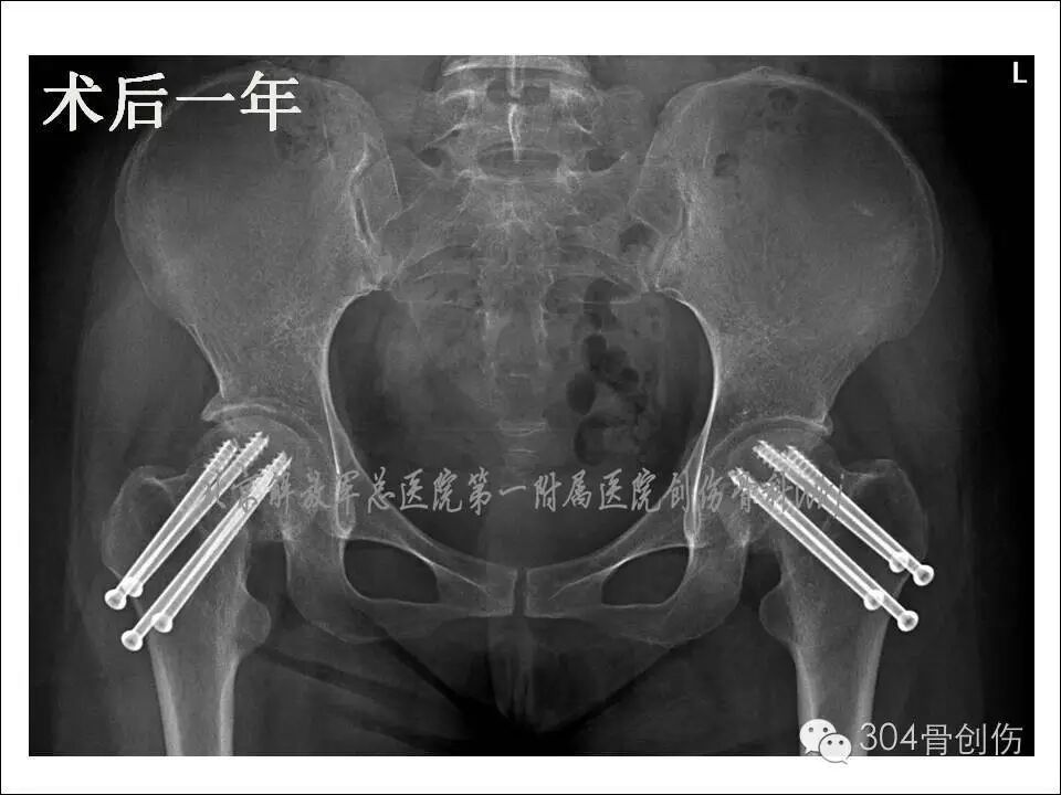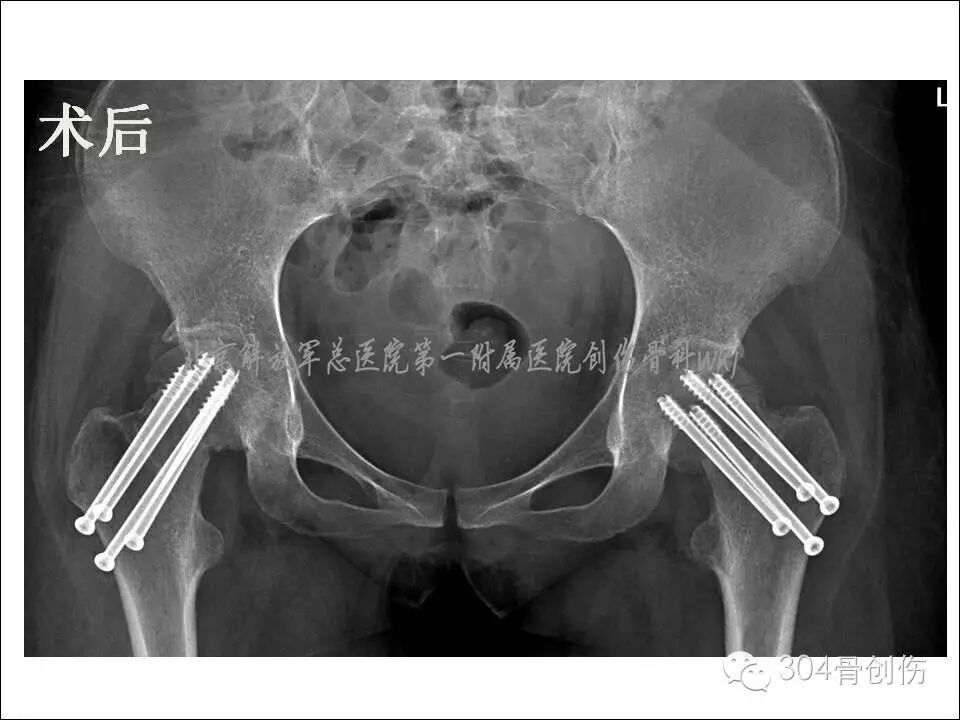 全麻下双侧股骨颈骨折闭合复位内固定。在C型臂透视下,牵引床辅助闭合复位,固定股骨头、下肢极度内旋,骨折复位满意,为增加固定强度,双侧各经皮打入4枚空心螺钉(图)。术后口服钙尔奇600mg每天2次,骨化三醇胶丸0.25ug 每天3次。双腿非负重活动。