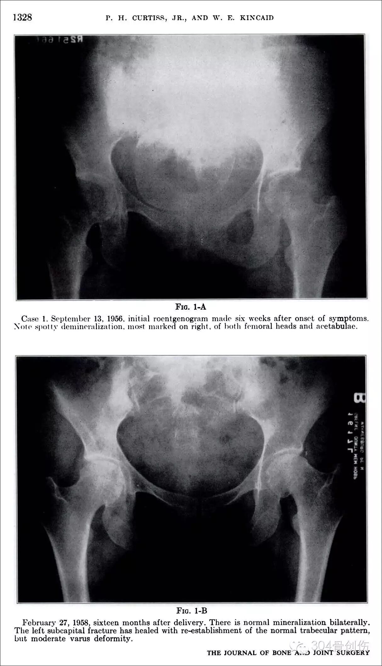 髋部一过性骨质疏松症(transient osteoporosis of the hip, TOH)是出现于妊娠晚期的一种罕见的骨代谢紊乱状况,其病因不清楚,表现为髋部疼痛及活动受限,可在髋关节X线上观察到明显骨量减少,1959年Curtiss教授首次报道(图),2005年国内郭依廷医生首次报道(图),综合发病过程,定义为“妊娠期一过性骨质疏松症”,不完全统计:全世界报道大约100余例,多为脊柱骨折,双侧股骨颈骨折少见,陈旧股骨颈骨折处理极为困难,目前缺乏大宗相关文献报道。
