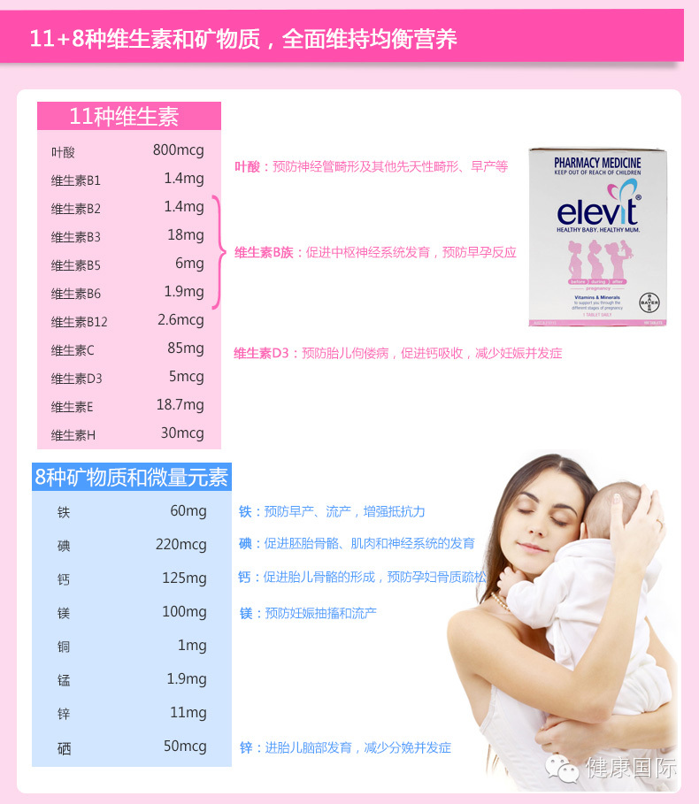 Elevit可防止出生胎儿的缺陷几率,如脊柱裂等问题。Elevit富含800mcg的叶酸,10多种维他命及7种微量元素。可帮助孕妇抗疲劳,补充铁。它全面的补充孕期所需元素。