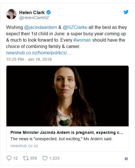 “祝愿即将在6月迎来第一个孩子的阿德恩和盖福德一切都好。2018年一定是非常繁忙同时也是非常值得期待的一年。每一位女性都应当有机会兼顾家庭和事业。”——海伦·克拉克(Helen Clark, 1999.12-2008.11任新西兰总理)