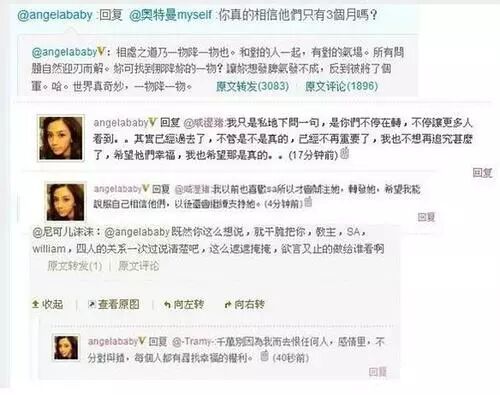 之后,阿sa便和陈伟霆分别在微博上承认恋情,而baby公然和粉丝留言:你真的相信他们只有三个月吗?
