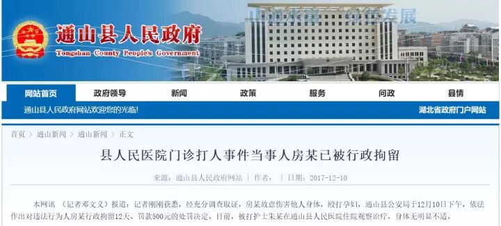 12月10日18时27分通山县人民政府发布通报称,经充分调查取证,房某故意伤害他人身体,殴打孕妇,通山县公安局于12月10日下午,依法作出对违法行为人房某行政拘留12天、罚款500元的处罚决定。