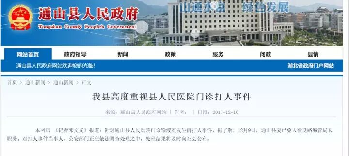 12月10日早上,湖北省通山县在官网发表声明称,针对通山县人民医院门诊输液室发生的打人事件,通山县委已免去徐良路城管局长职务。对打人事件当事人,公安部门正在依法调查处理之中,处理结果将及时向社会公布。
