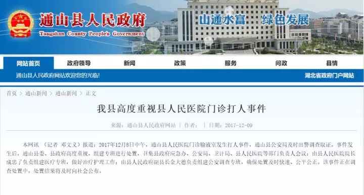 12月9日,通山县委宣传部通报称,2017年12月8日中午,通山县人民医院门诊输液室发生打人事件,通山县公安局及时出警调查取证。