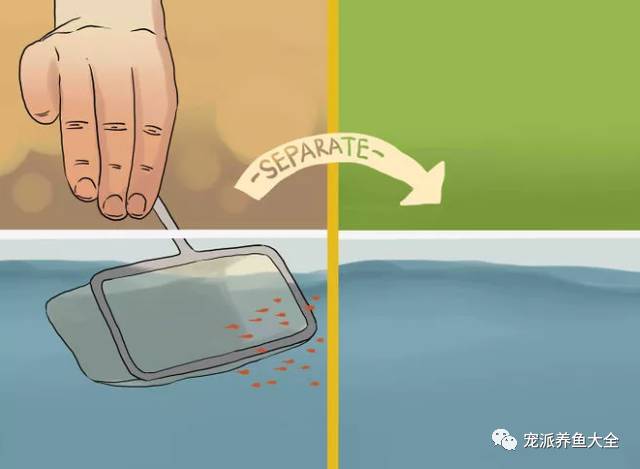 如果成年鱼在产卵后会保护巢和幼鱼,请用鱼网将其它鱼和幼鱼分开,将幼鱼和雌雄鱼归于一处。