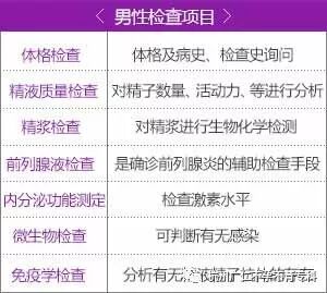 而男性的检查项目主要有:尿道检查、性激素检查、性功能检查、睾丸检查、免疫因素检查、内分泌检查、精索静脉曲张检查、创伤检查、精子质量检查等。