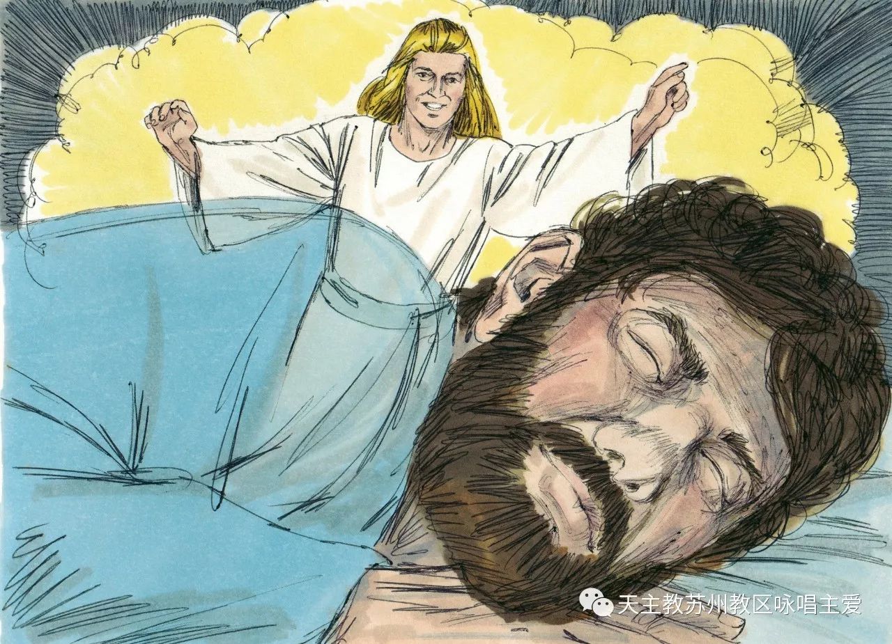 当他在思虑这事时,看,在梦中上主的天使显现给他说:「达味之子若瑟,不要怕娶你的妻子玛利亚,因为那在她内受生的,是出于圣神。