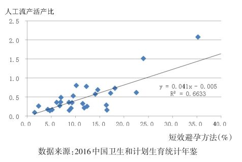 大数据分析显示,短效避孕措施使用比例的上升与人工流产水平的上升有密切的关系。图2为2013年全国30个省市已婚育龄避孕妇女(无西藏避孕率信息)使用短效避孕措施的比例与各省人工流产活产比(各省人工流产总数/活产总数)的关系,可见短效避孕措施比例每增加1%,人工流产活产比约上升4.1%,两者线性关系明显。