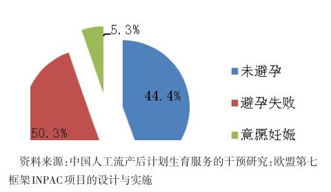 未满足的避孕需求简单来说是指应该避孕而未避孕。其原因包括,担心避孕药具对妇女自己或小孩(尤其是哺乳妇女)的副反应,或者由于配偶的反对(如丈夫拒绝使用避孕套),或者一时没有找到合适的避孕方法,或者因为避孕知识的缺乏等。由于我国已婚育龄妇女综合避孕率较高,未满足的避孕需求比例相对不高,2006年全国调查数据未满足避孕需求的比例为2.3%[8] ,2011年上海全市抽样调查数据显示避孕需求未满足的比例为2.4%。近几年的全国未满足避孕需求比例未见报道,有关方面估计,我国有近1400 万妇女没有采取有效避孕措施,约占全球7%。避孕需求未获满足的妇女是人工流产的高危人群。2013年一项在全国30个省市296家医院对7.9万流产妇女的调查显示,44.4%人工流产对象妊娠的原因是未避孕(图3)[9] ,其中很大一部分对象应是避孕需求未获得满足。从时点上看,未婚时期、产后1年内以及围绝经期妇女是避孕需求未满足的高峰时期。因此,应作为避孕服务的重点人群。