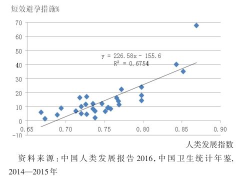 图6 中国各地区人类发展指数与短效避孕措施使用比例的关系