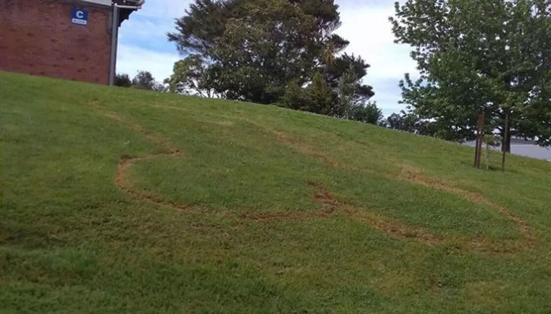 上周日,在奥克兰Birkenhead College校内的草坪上出现了一幅大型男性生殖器官的图案。有人用手机将其拍下,然后放到脸书上。