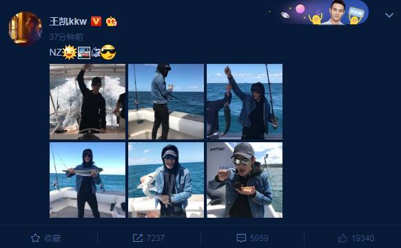 11月6日,演员王凯在微博晒出自己在纽西兰海上出游的照片。王凯正在船上钓鱼,从表情来看十分开心。该微博一共发布了六张照片,记录了王凯在新西兰出海钓鱼,吃海鲜等细节。王凯还与小鲨鱼搞怪合照,莫名的还有几分相似。