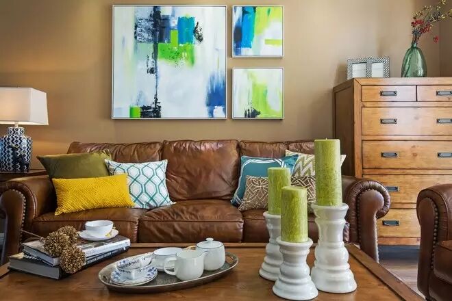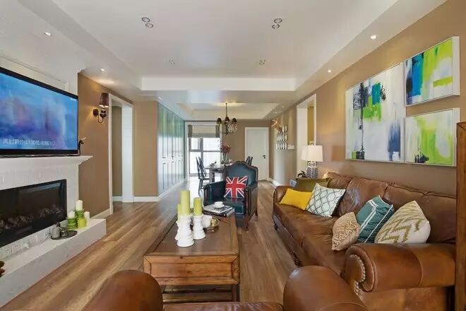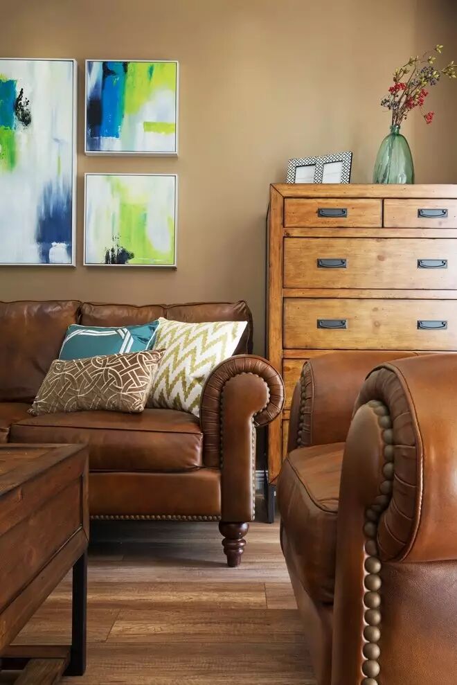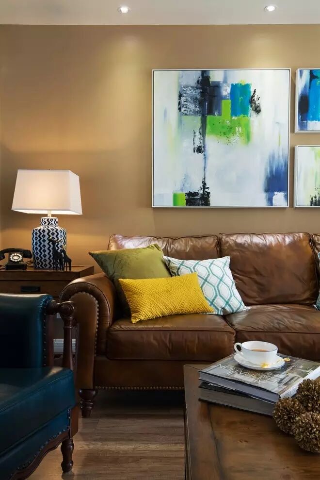 深棕色的铆钉皮沙发显示出大地的色调,搭配上颜色鲜艳的抱枕,围合出客厅的休闲空间。同色系的墙面、茶几和储物柜,又增强了整体空间的协调性。