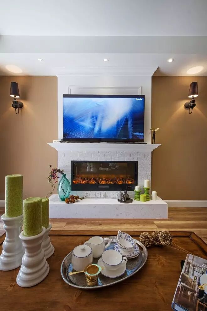 电视柜兼具壁炉的功能。寒冬时分,家人围坐一起,烤火看电影,好不惬意。