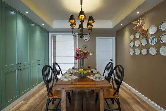 餐厅里设置的薄荷绿餐边收纳柜,使整个餐厅看上去更加整洁大气,和谐统一。储物功能也是发挥到了极致。