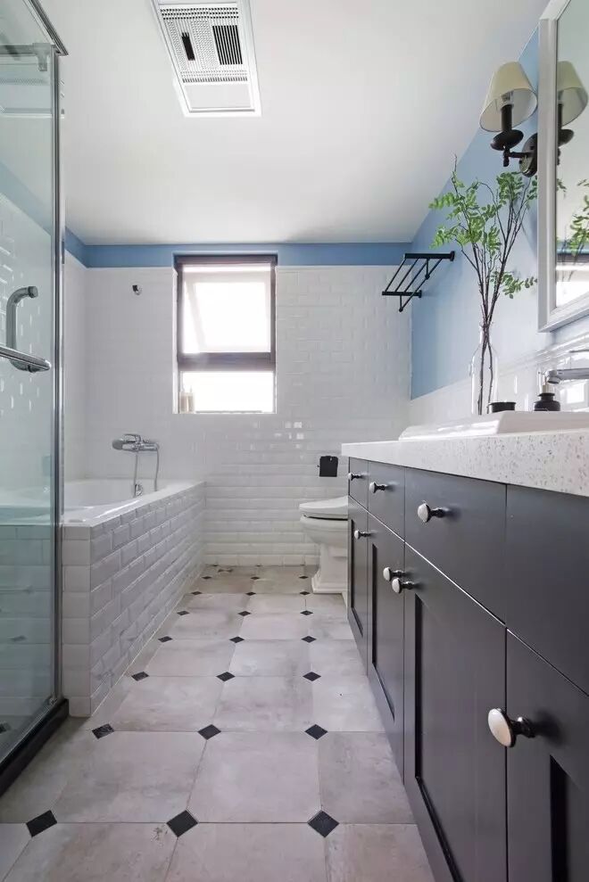 houzz风格的卫生间,防水乳胶漆加墙砖的结合让空间得以延伸,风格更加统一,让沐浴变成了享受。