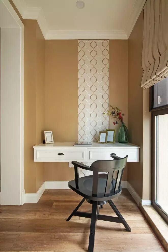结合卧室阳台角落的构造,设计成砌入墙内的书桌,节省空间,且加强了空间的整体感和功能性。