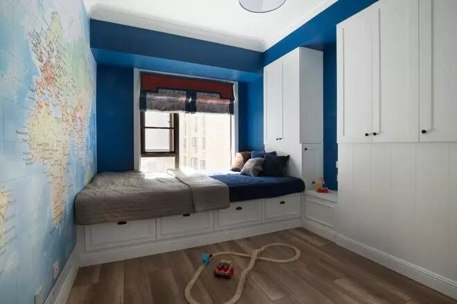 为了符合孩子的特质,男孩房采用了夜空蓝和地图墙的搭配方案。从飘窗延伸出来的榻榻米,既增加了储物空间,又使房间变得更加宽敞。随着孩子年龄的增长,添置书桌书架等也很方便。