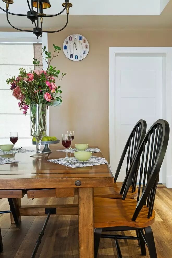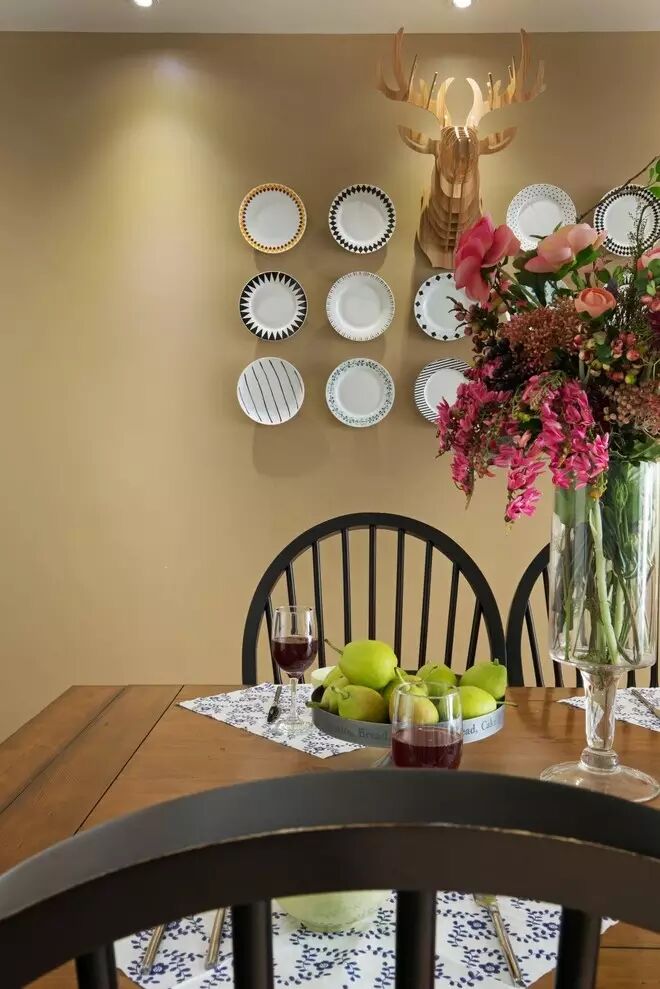 餐厅墙面的装饰,别致格调不落俗套。餐桌上方按一个温暖的吊灯,给家庭聚餐创造温馨的氛围。与地板同色系的木质餐桌,彰显整体协调性。