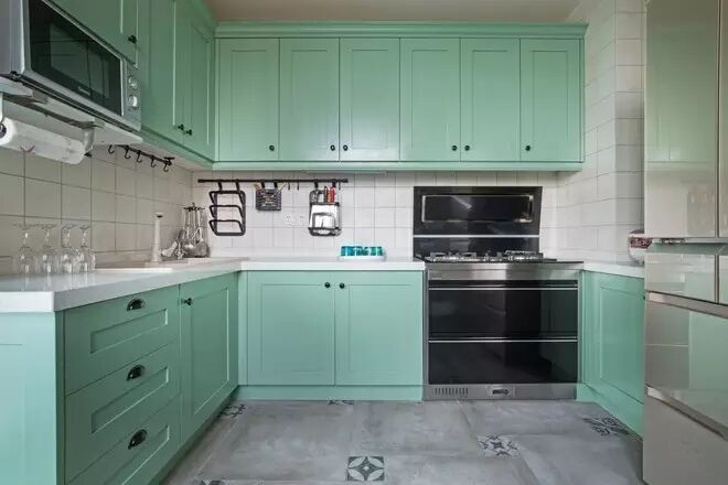 厨房也采用了薄荷绿的配色方案,搭配白色的小方砖,让本来充满油烟的地方变得清新明媚起来。