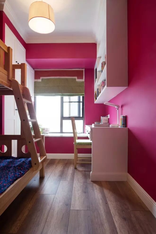 由于房间面积偏小,女孩房的书桌书柜以及衣柜结合了飘窗做了统一的规划,大大提升了空间利用率。