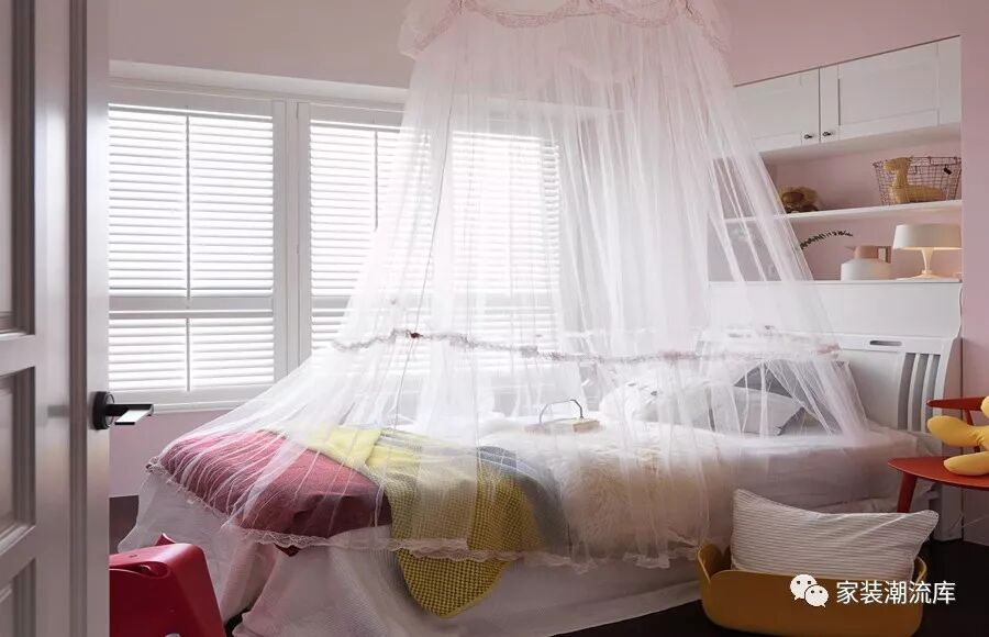 粉色的背景墙、浅粉色的纱帐、小巧可爱的单人床、造型喜人的小玩偶,让这个房间充满了梦幻的色彩,少女感十足,哪个女生能抵抗得了呢?