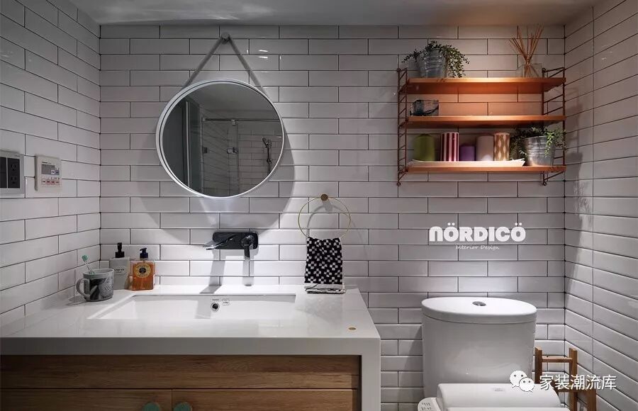 卫生间整体色调同样以白色为主,干净明亮。在坐便器的上方设置置物架,与洗脸盆上方的镜子对称分布,既平衡了空间的重心,又增添了收纳功能,美观又实用。