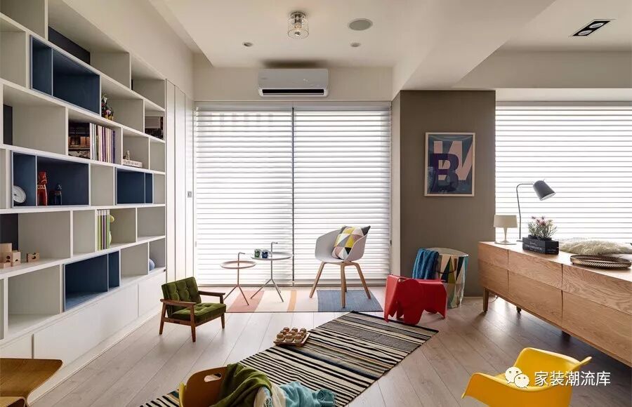 通过矮柜将客厅分隔为两部分,作一个休闲娱乐的功能分区。在靠近窗户的区域,铺上地毯,摆上茶几和椅子,一个简易的茶座就成型了,有空约朋友坐着喝茶聊天,中间铺设地毯,留出足够的空间可以让小孩玩耍,悠闲而又惬意。