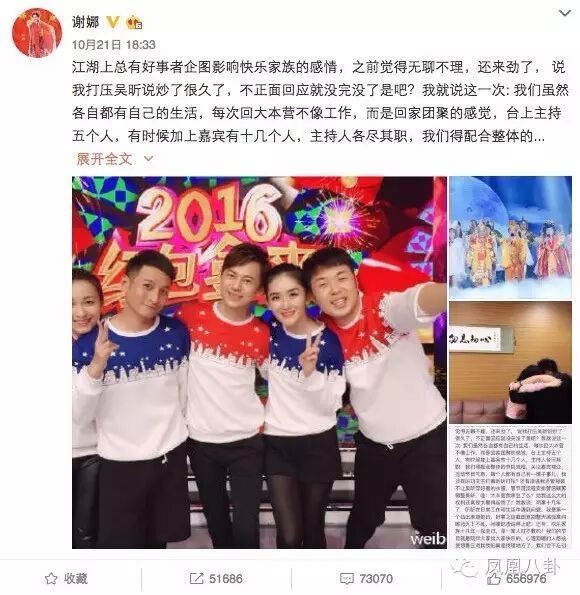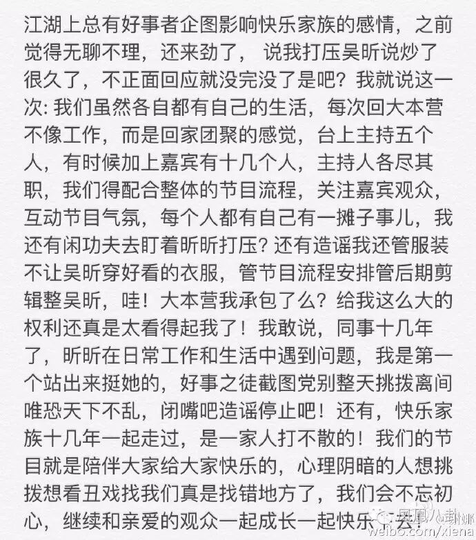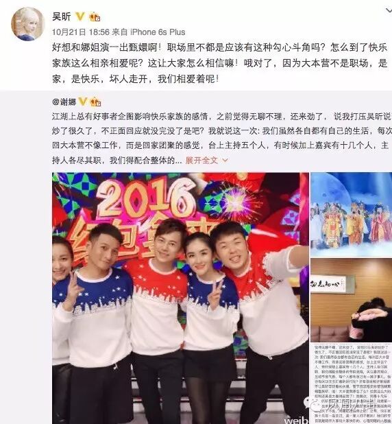 10月21日晚,谢娜在微博发长文否认打压吴昕,表示快乐家族同事十几年就像家人,斥责好事者胡编乱造。