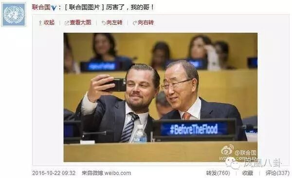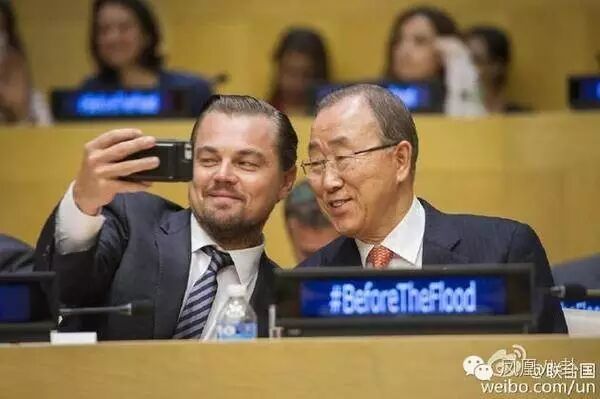 10月22日,联合国官方微博上晒出一张演员莱昂纳多与联合国秘书长潘基文的合照。