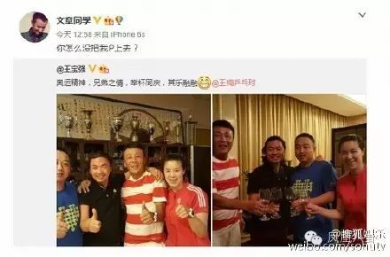 10月22日,乒乓球国手王楠老公郭斌在网上晒出一组与王宝强、文章的合照,并配文:“今天三缺一,只能二打一了,平手@刘国梁”。