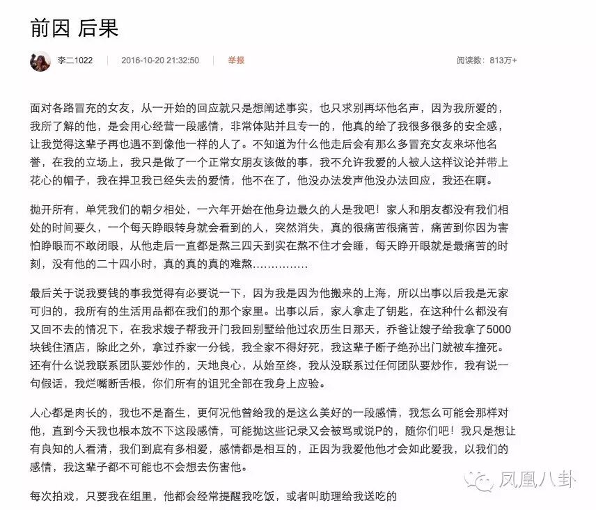 近日,疑似乔任梁女友的微博网友“李二1022”发布微博长文《前因,后果》,回应了靠乔任梁炒作的争议。