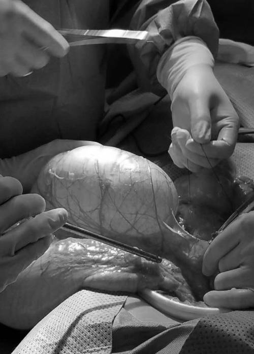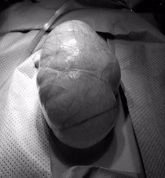手术中刚开腹,大如篮球、重达十斤左右的病灶从肚皮中自己”蹦“了出来