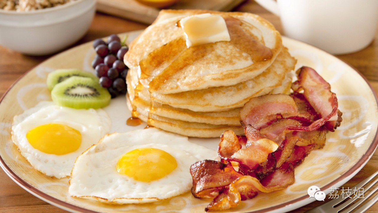 面包、鸡蛋,熏肉、、蔬菜,煎蛋卷、葡萄干、巧克力、咖啡、棒棒糖和水果