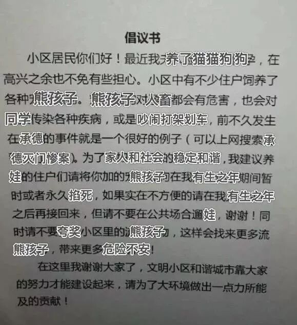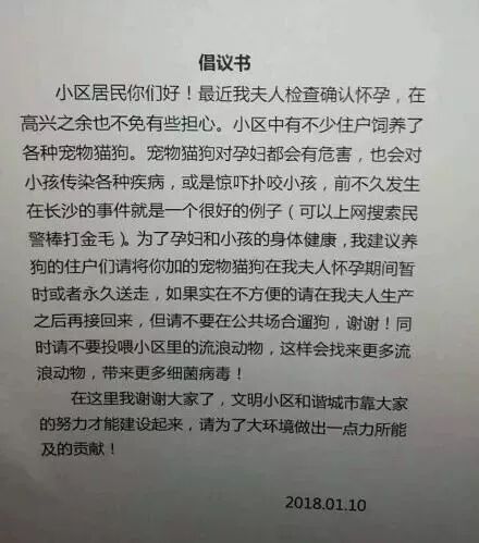 1月10号,安徽合肥某小区里出现了这样一封“倡议书”:一位业主表示,因夫人怀孕,为了孕妇和孩子的身体健康,建议小区其他住户把自家的宠物(狗、猫…等)暂时或永久送走,等他妻子生产完毕再接回来,并且,回来以后也不要在公共场合遛狗...