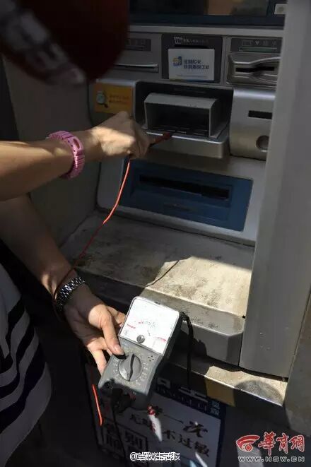 23岁的小刘在西安一个ATM机上取钱,输密码时,突然电流就从两手传至全身,小刘甩手尖叫瞬间弹开,后来发现两个手指头的指甲断裂。记者带着万用表现场测试发现,电击女孩的ATM机带电电压200伏,而人体能承受的安全电压是36伏。(via.华商网)